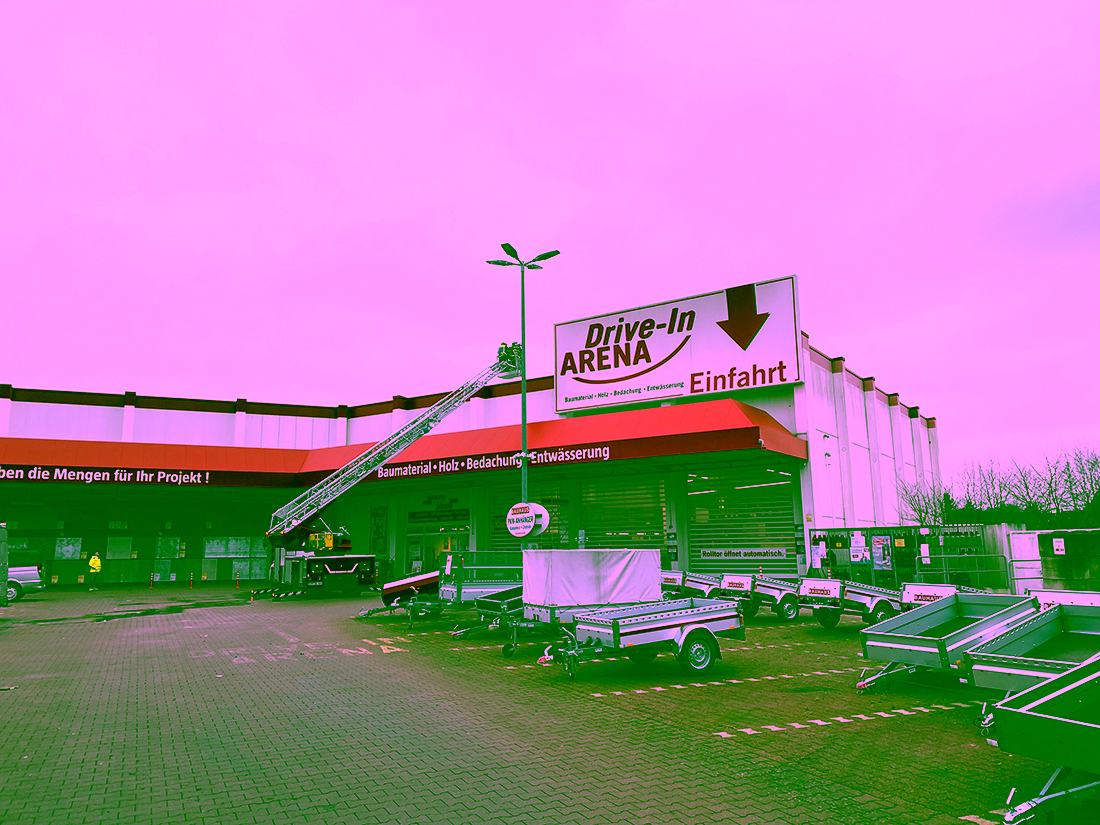 Unter der Einwirkung des Sturms wurde ein ca. 13 x 6 Meter großes Werbeschild eines Baumarktes aus seiner Halterung gerissen – und drohte abzustürzen. Zunächst haben wir den Gefahrenbereich großräumig abgesperrt. Mit Hilfe unserer Drehleiter verschafften wir uns einen Zugang zum Dach.