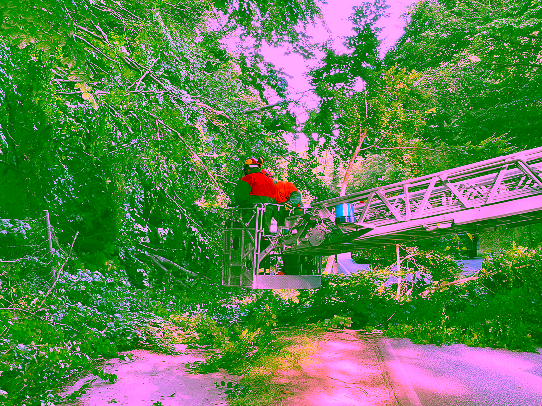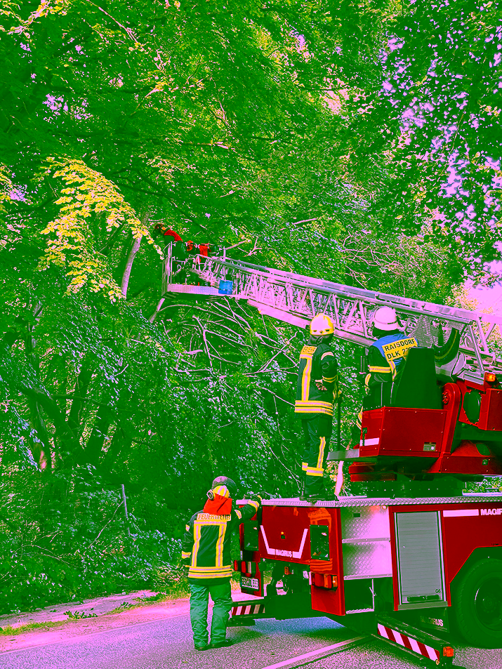 Mit Hilfe einer Kettensäge, wurde die Gefahrenstelle, unter dem Einsatz unserer Drehleiter, beseitigt.