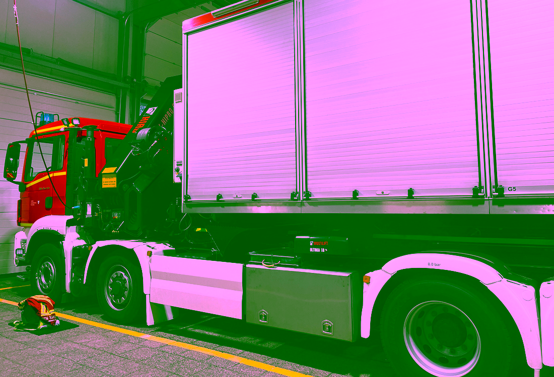 Beeindruckend aufgrund der Größe und der Ausstattung mit einem Kran war überdies das Wechsellader-Fahrzeug, das zum Transport von Abrollbehältern zur Einsatzstelle dient.