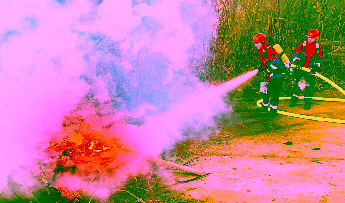 Nachdem die neue Jugendgruppenleiterin Julia Sabelus die Kameradinnen und Kameraden auf die einzelnen Feuerwehrfahrzeuge verteilt hatte, ging es schnell zum Einsatzort. Dort angekommen, wurde sofort eine Löschwasserversorgung aufgebaut, um das Feuer, welches in einer Feuerwanne brannte, schnellstmöglich unter Kontrolle zu bringen. Die neue Chefin der Jugendfeuerwehr ließ es sich dabei nicht nehmen, ganz vorne am Strahlrohr den Brand zu bekämpfen. Schon bald konnte „Feuer aus!“ gemeldet werden.