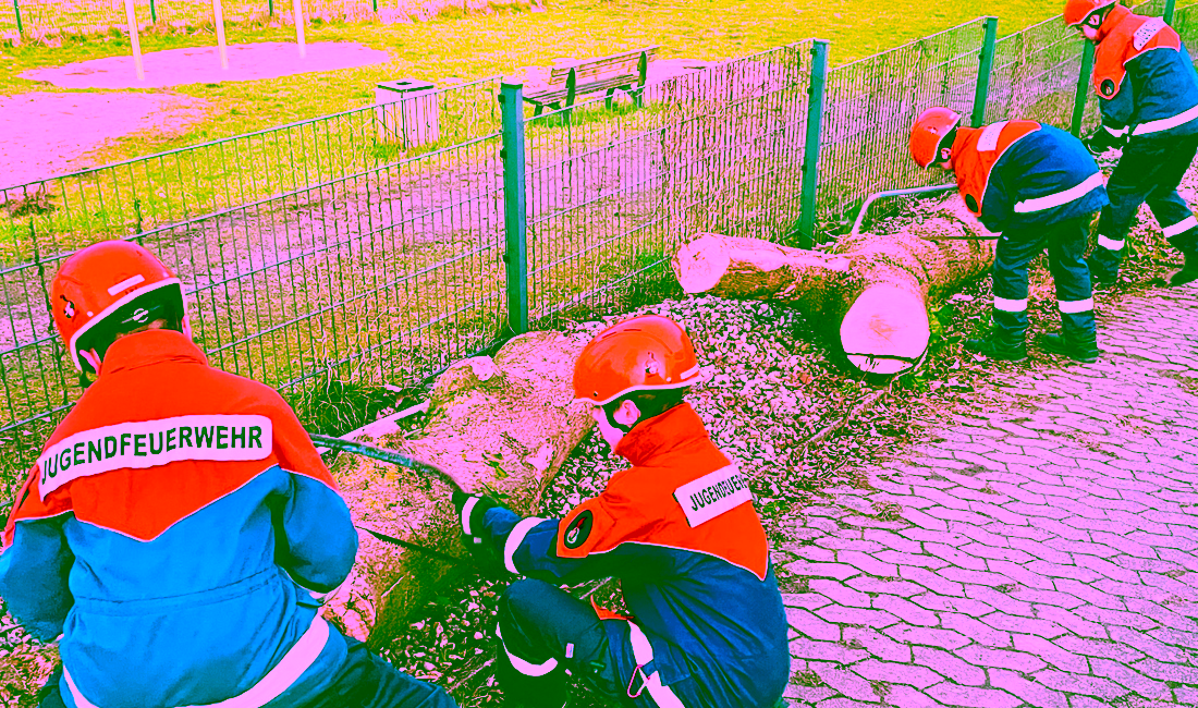 Weitere Kameradinnen und Kameraden unserer Jugendfeuerwehr kümmerten sich zwischenzeitlich um die umgestürzten Bäume – und zwar mit Handsägen! Eine Herkulesaufgabe! Das liegt natürlich daran, dass die Jugendlichen noch keine Motorsäge bedienen dürfen. Andererseits ist es aber auch so, dass in der Seefahrt die Matrosen bei ihrer Ausbildung lernen, nach den Sternen zu navigieren, die Kapitäne hingegen auf die satellitengestützte Navigation zurückgreifen dürfen. Man muss eben alles von der Pike auf lernen. Und Lehrjahre sind keine Herrenjahre!