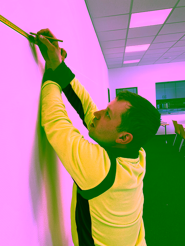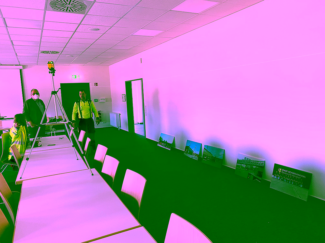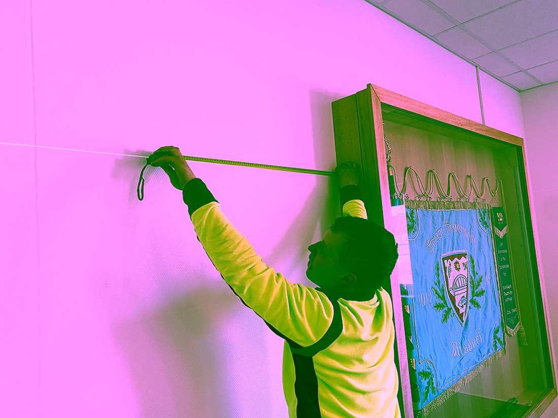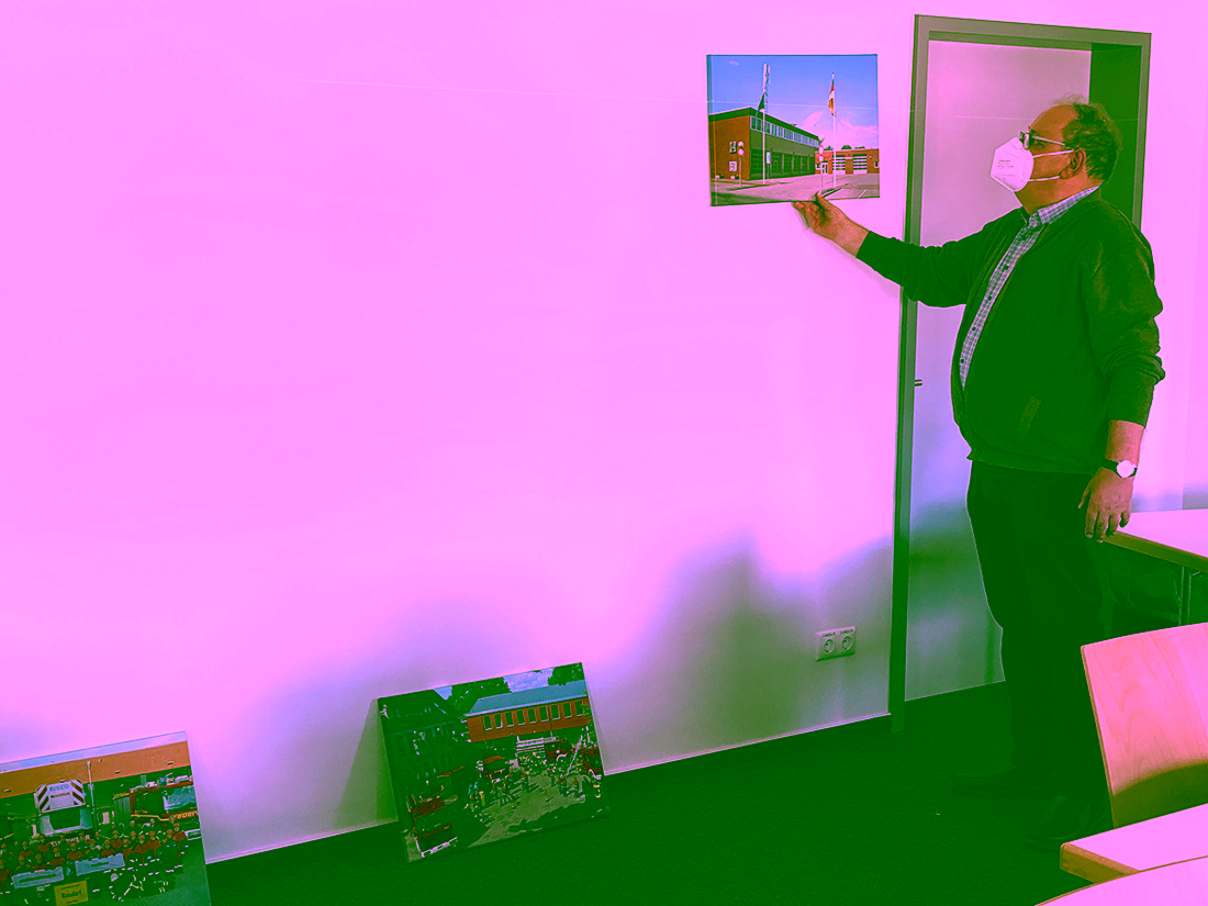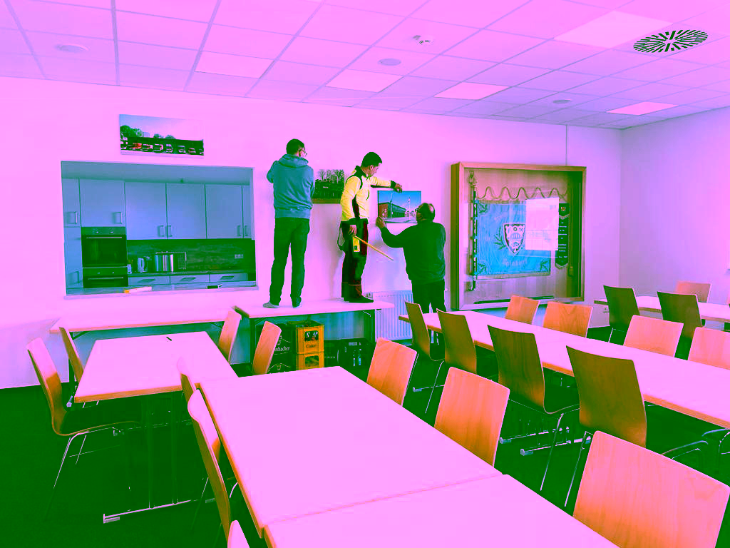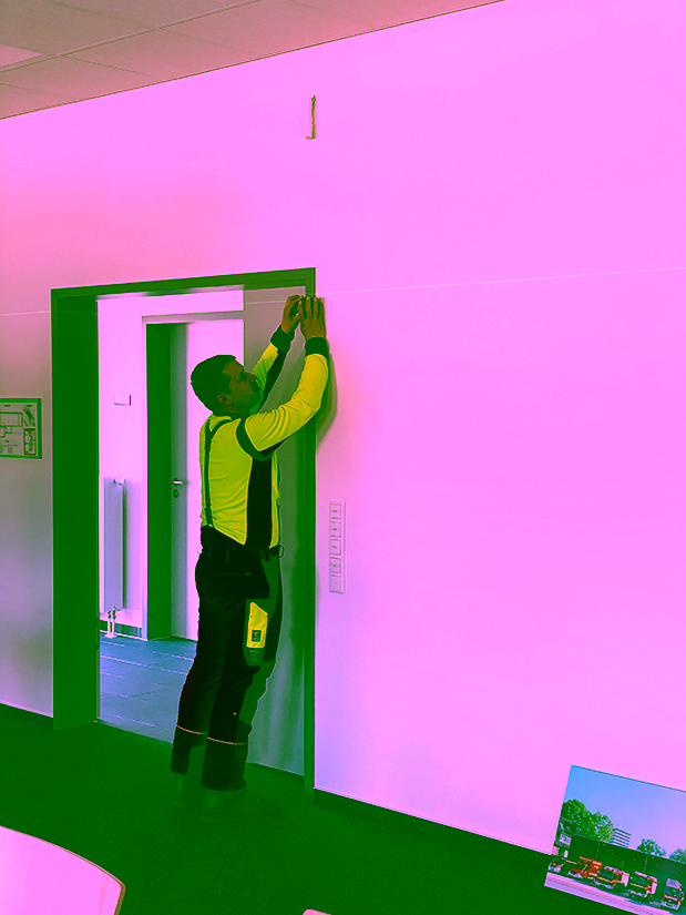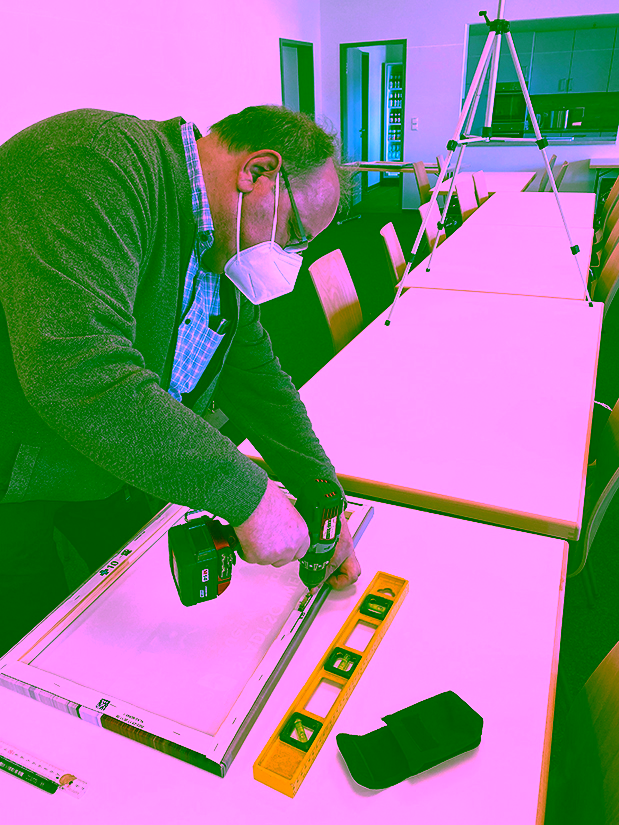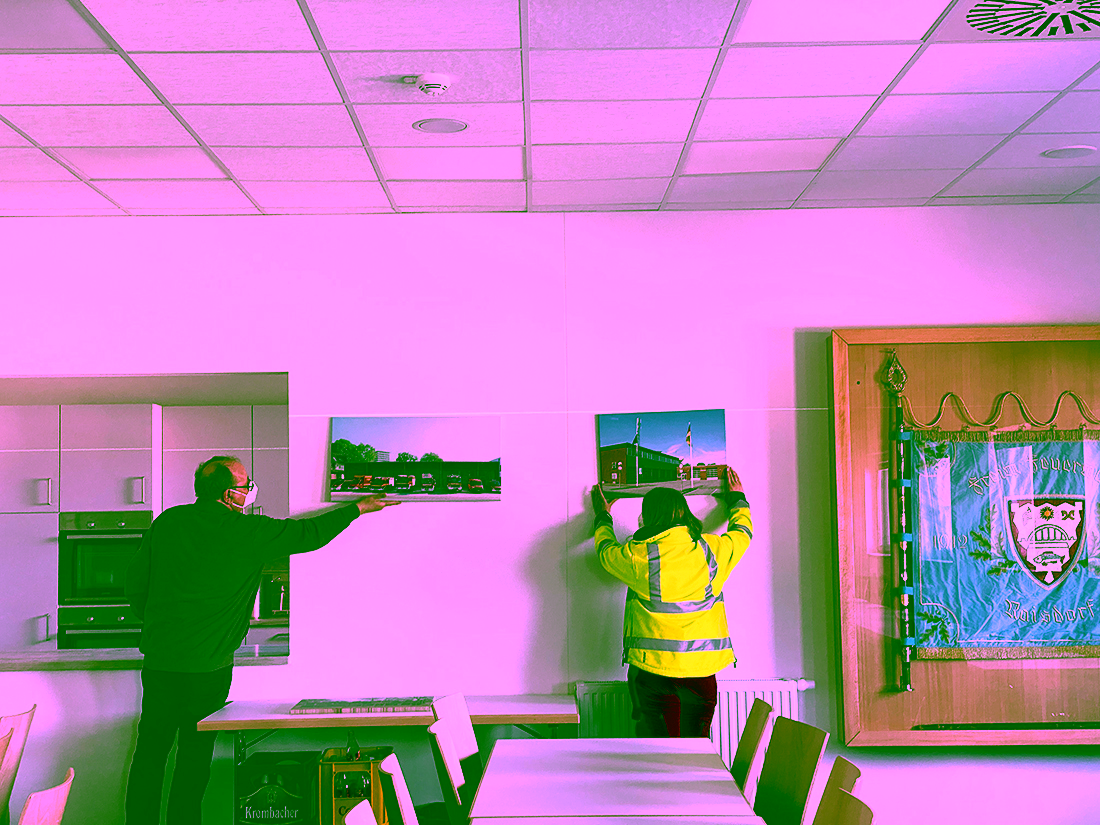 Zusammen mit unserem Gruppenführer Timo Baldowsky hat Wilfried Pöhlmann die Fotos an den bis dato kahlen Wänden des Feuerwehrhauses angebracht. Dabei wurde selbstverständlich nichts dem Zufall überlassen: Zum Anbringen der Bilder verwendete Timo Baldowsky ein Nivelliergerät, also ein optisches selbst horizontierendes Messinstrument zur Bestimmung von Höhen. Denn nichts ist schlimmer, als wenn ein Bild schief hängt, wie wir ja alle wissen.