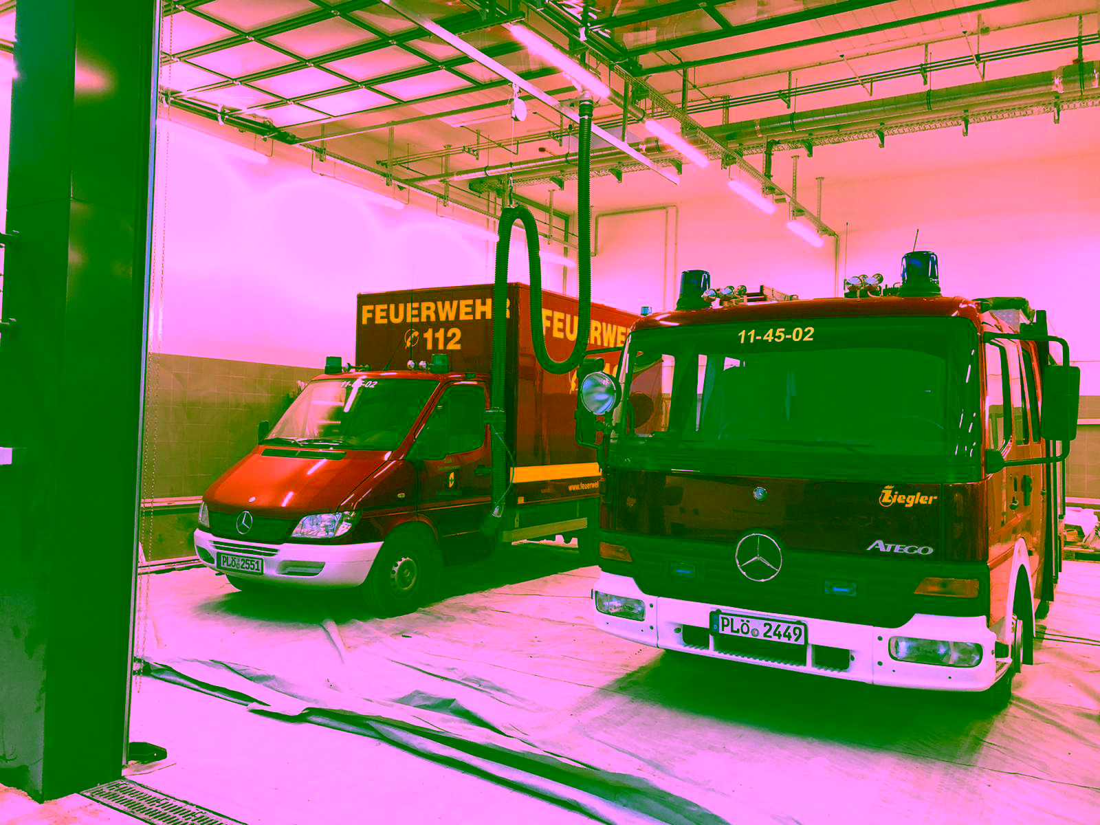 Mit den Fahrzeugen in der Halle sah das neue Gebäude erstmals so richtig nach einem Feuerwehrhaus aus.