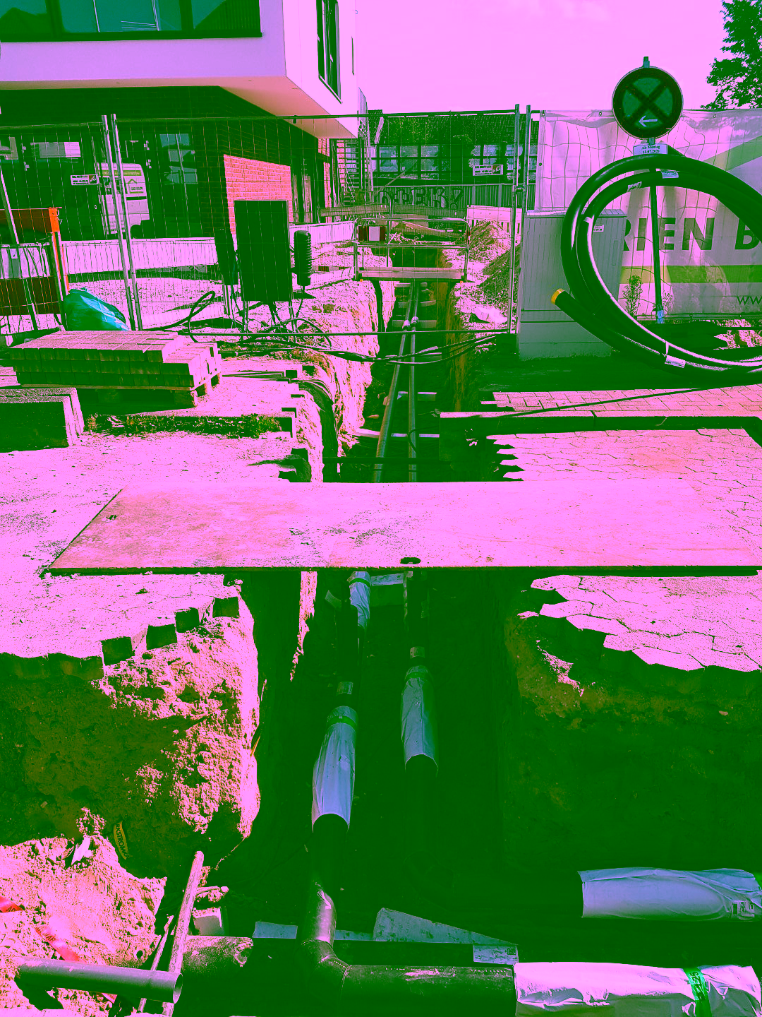 Außen kann man man schon die Wäremleitungen im Graben bis zur Wache sehen.