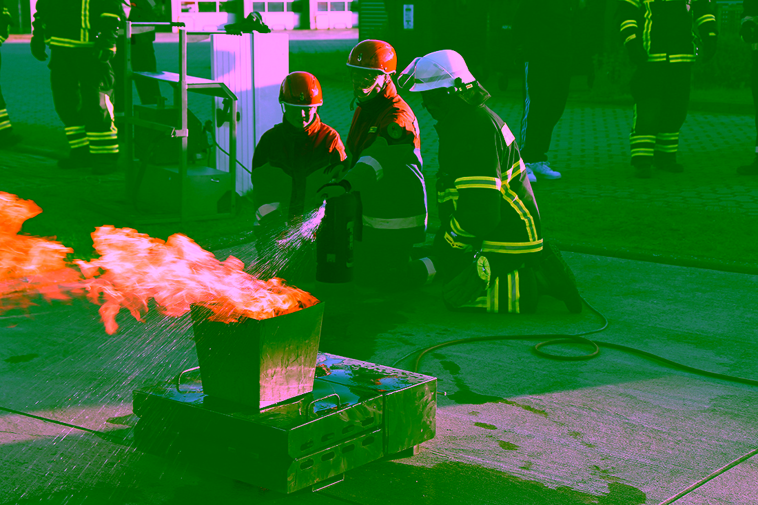 Nach dieser anschaulichen Demonstration eines Fettbrandes durch unseren Ortswehrführer Stefan Kühl ging’s dann ans Löschen eines herkömmlichen Brandes (eines Fettbrandes) durch die Jugendlichen mit Wasser. Hierzu wurde in einer speziellen Vorrichtung durch unseren Jugendfeuerwehrwart Marco Beinke mittels einer Fernbedienung Feuer entfacht.