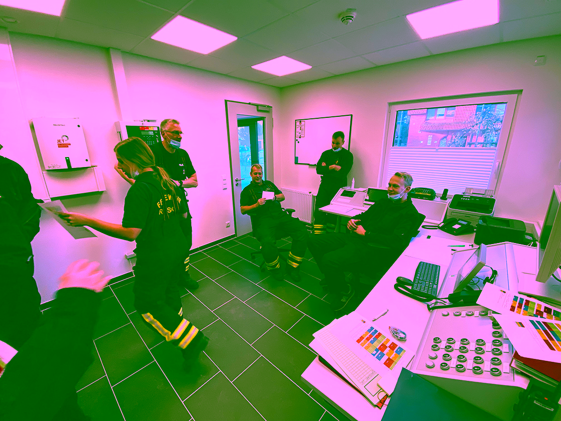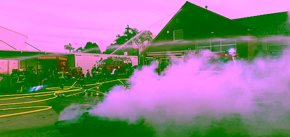 Höhepunkt am Abend war dann eine große Einsatzübung auf dem Bauhof der Stadt Schwentinental in der Klausdorfer Straße. In der dortigen Werkstatt war es zu einer Verpuffung mit einer starken Rauchentwicklung gekommen. Mehrere Personen wurden vermisst und mussten von den jungen Feuerwehrleuten unter Atemschutz in dem Gebäude gesucht werden (hierbei kam keine echte Atemschutzausrüstung zum Einsatz, sondern ein für Jugendfeuerwehren speziell konstruierter Übungs-Atemschutz). Ein Unglück kommt selten allein: Zusätzlich war vor dem Werkstattgebäude ein großes Feuer ausgebrochen, das gelöscht wurden musste. Diese Aufgabe lösten zwei junge Feuerwehrkameradinnen mit Bravour! Doch damit nicht genug: Durch die Verpuffung in der Werkstatt war das Gebäude in Brand geraten, so dass ein umfangreicher Löschangriff mit einer unübersichtlichen Anzahl von Schläuchen und Verteilern aufgebaut werden musste.