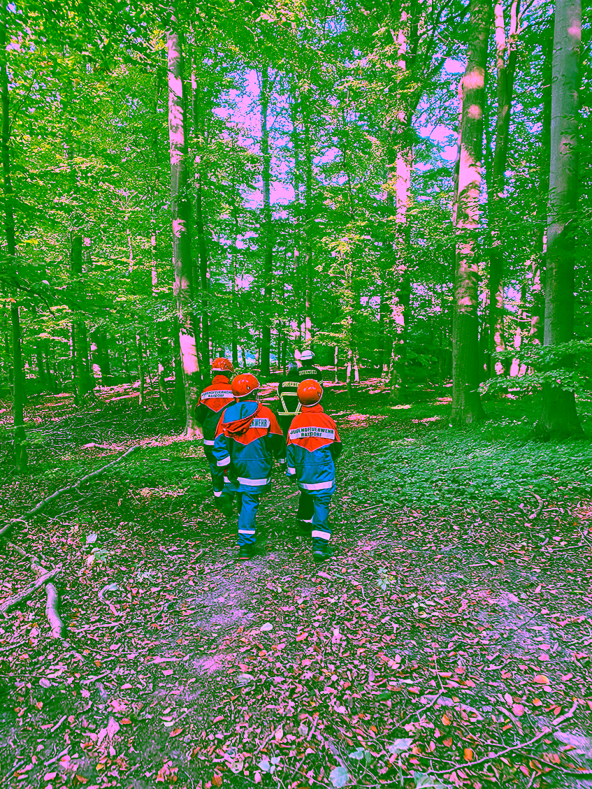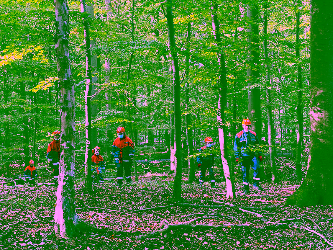 Im Klosterforst suchten die Jugendlichen nach einer vermissten Person; der Kamerad der Feuerwehr Raisdorf Dirk Schöne hatte sich hierfür tief im Unterholz versteckt.