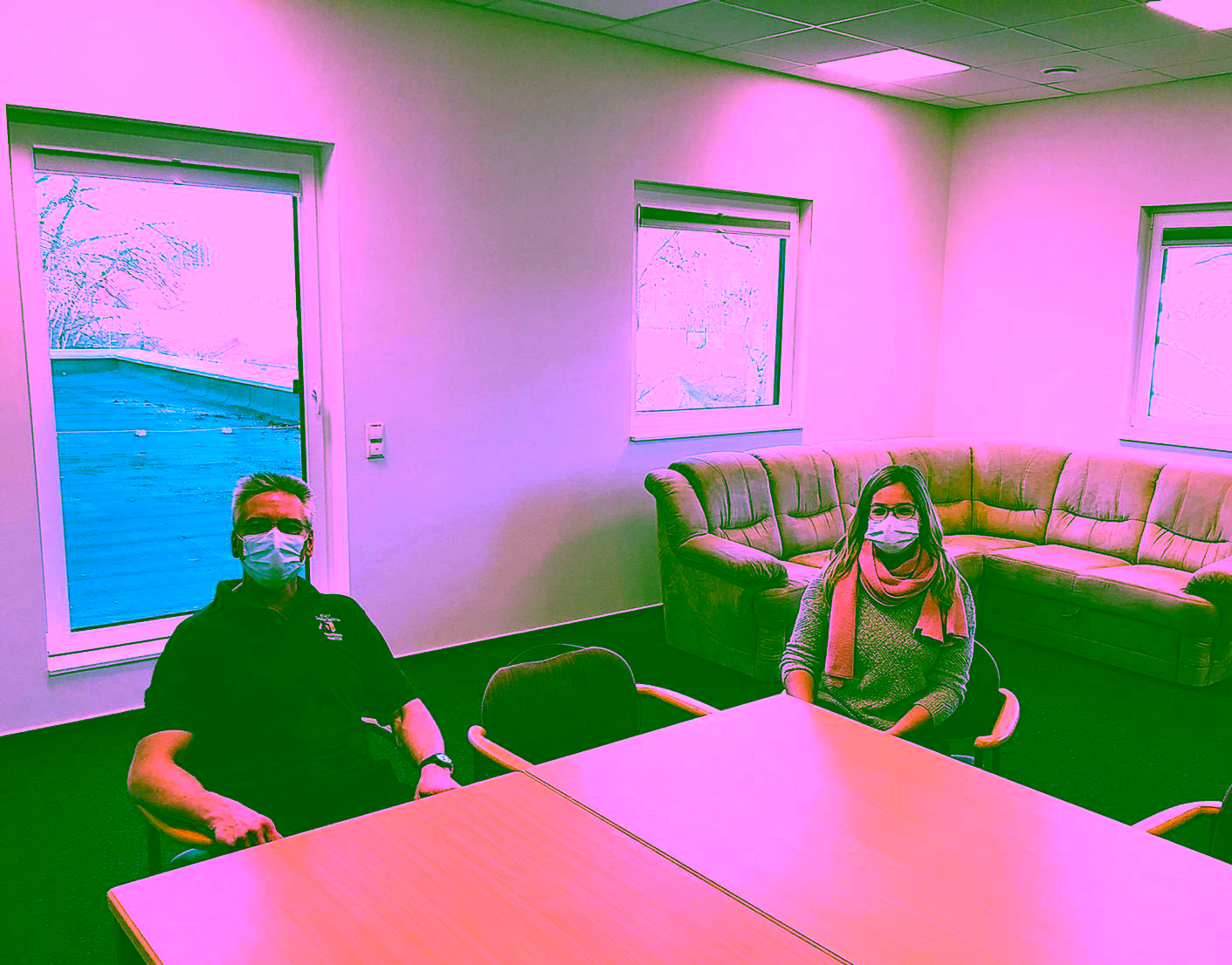 Irgendwann wird sich auch die Jugendfeuerwehr endlich in ihrem neuen Raum treffen dürfen – und am Tisch sitzen wie hier Markus Nitschmann und Laureen Vöge. Oder sich aufs Sofa im Hintergrund lümmeln, welches übrigens aus privaten Beständen der Familie Nitschmann stammt und der Stadt ebenfalls kostenlos zur Verfügung gestellt wurde.