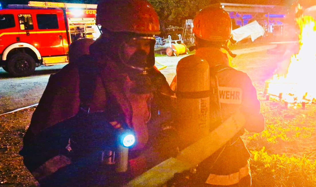 Nach einem gemeinsamen abendlichen Grillen wurden die Jugendlichen dann richtig unruhig, weil sie bemerkt hatten, dass etwas in der Luft lag: Die Großübung stand an! Feuer mit Menschen in akuter Lebensgefahr! In der Weinbergsiedlung, Totenredder. Starke Rauchentwicklung! Vermisste Personen! Gebäudebrand (Paletten) mit verrauchter Werkstatt (Nebelmaschine) und dort vermissten Personen. Ein Löschangriff musste aufgebaut werden.