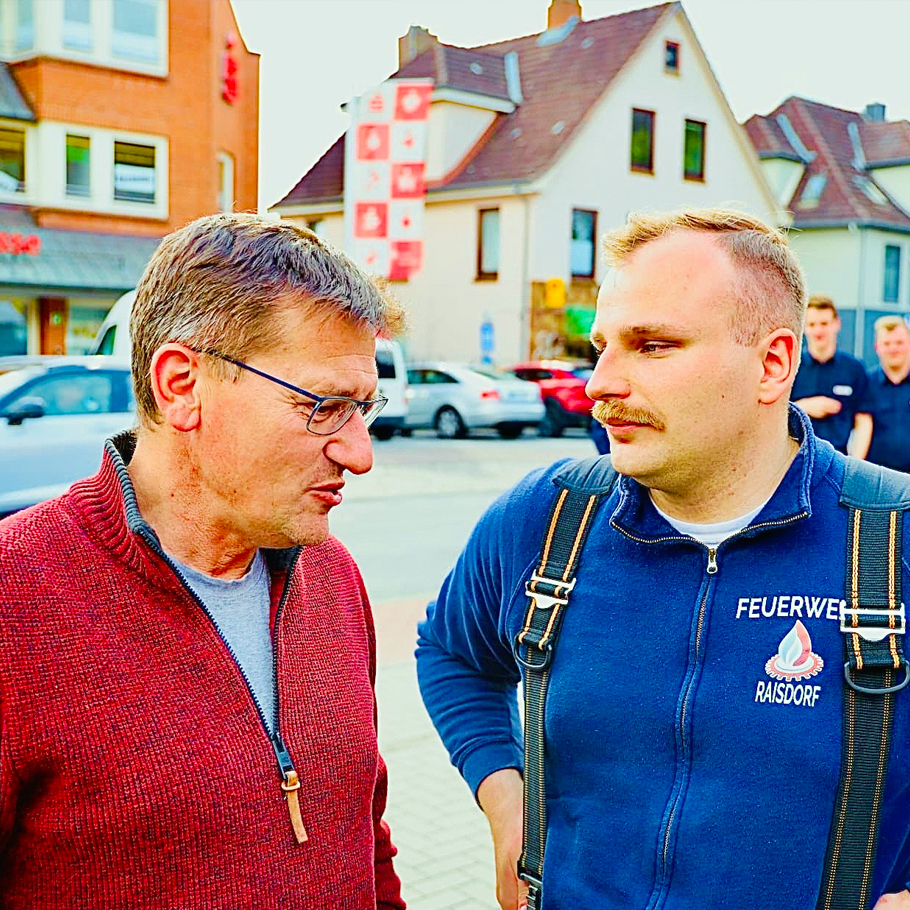 Organisiert hatte den RescueDAY 2025 unser Kamerad und Gruppenführer René Stiem, dem für die herausragende Organisation dieses Tages großes Lob und großer Dank gebührt. René, Du hast Dir mit der Organisation dieses Tages einen Namen gemacht! Das Foto zeigt René, der derzeit im Rettungsdienst Ostholstein seine Ausbildung zum Notfallsanitäter absolviert, im Gespräch mit unserem Bürgermeister Thomas Haß, welcher dem RescueDAY2025 einen Besuch abstattete.