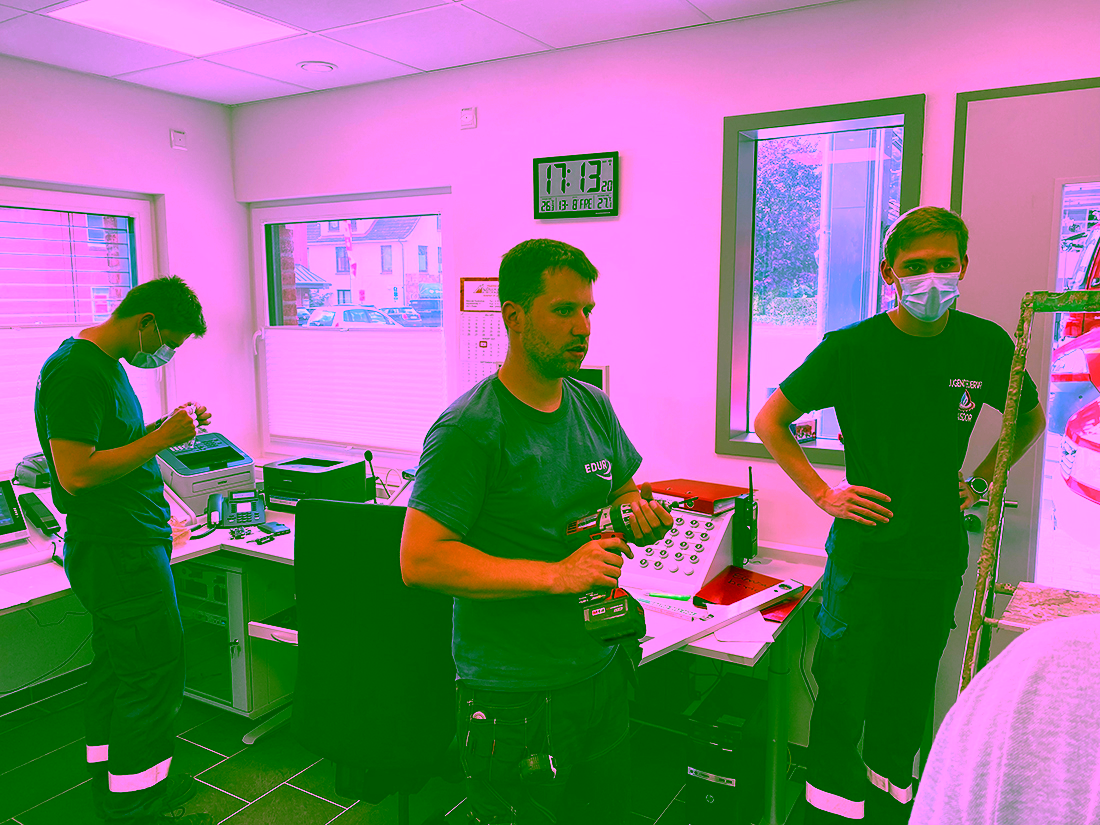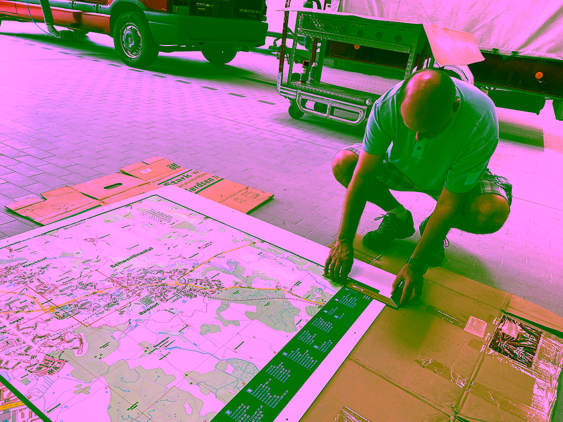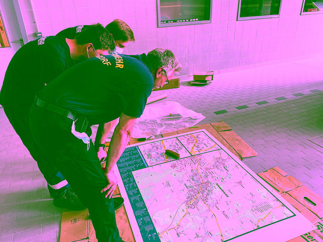 Die Karte unserer Stadt wurde zunächst akkurat auf einen festen Untergrund aus dünnem Stahl aufgebracht. Anschließend passten die Kameraden Lars Schell (im Vordergrund) und Markus Nitschmann (im Hintergrund) die Karte an die Wand in der Einsatzzentrale an, wobei Timo Baldowsky mit Wasserwaage und Bleistift für die absolut gerade Aufhängung sorgte. Jetzt hängt Schwentinental gerade, denn schräge Sachen machen wir nicht.