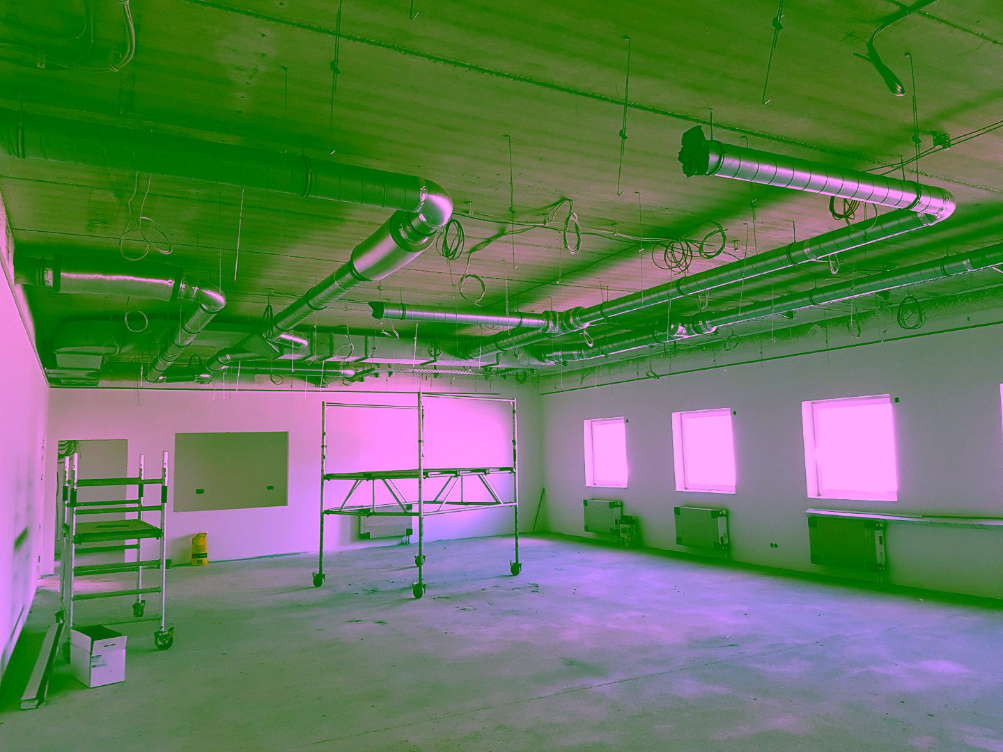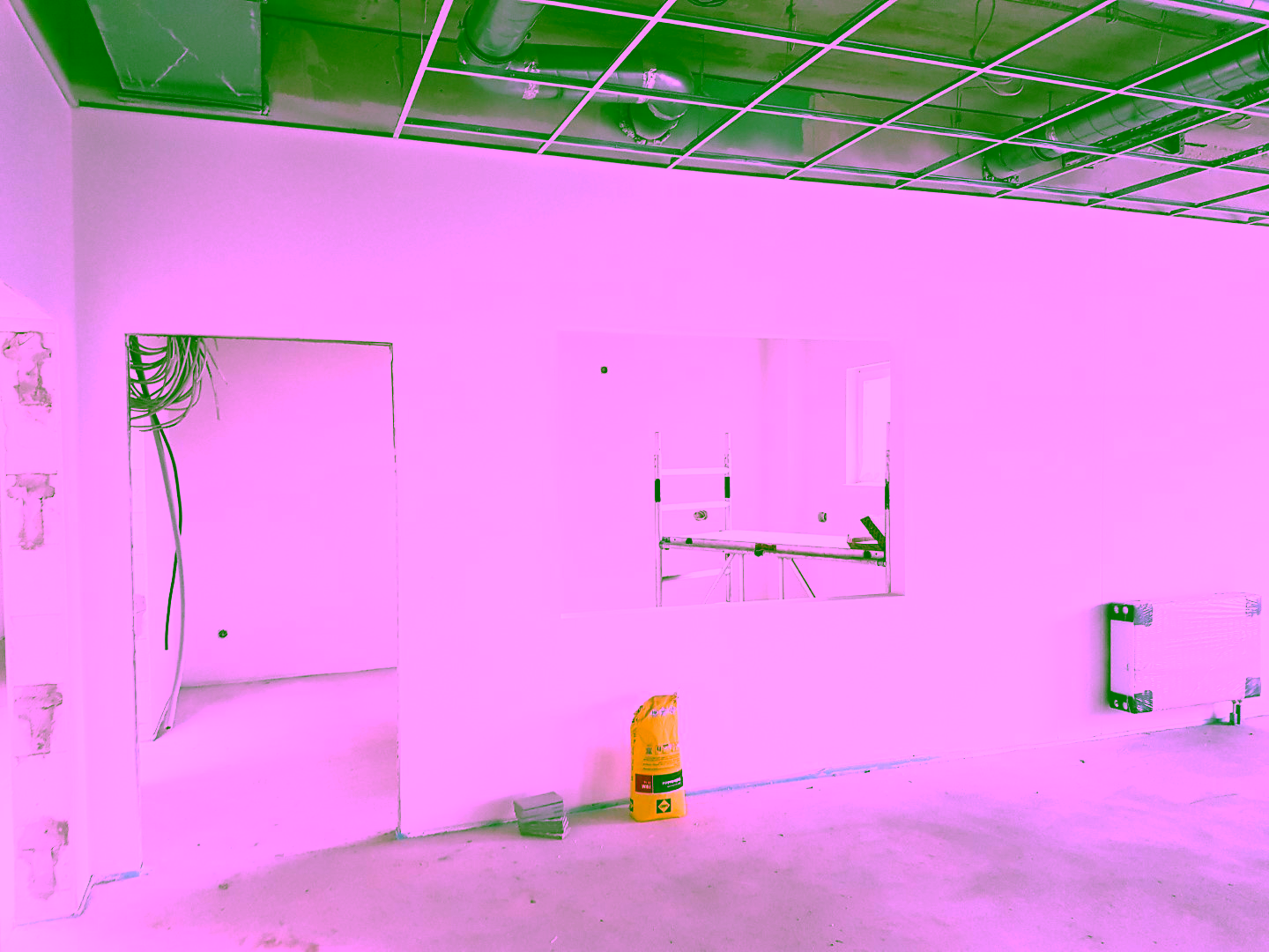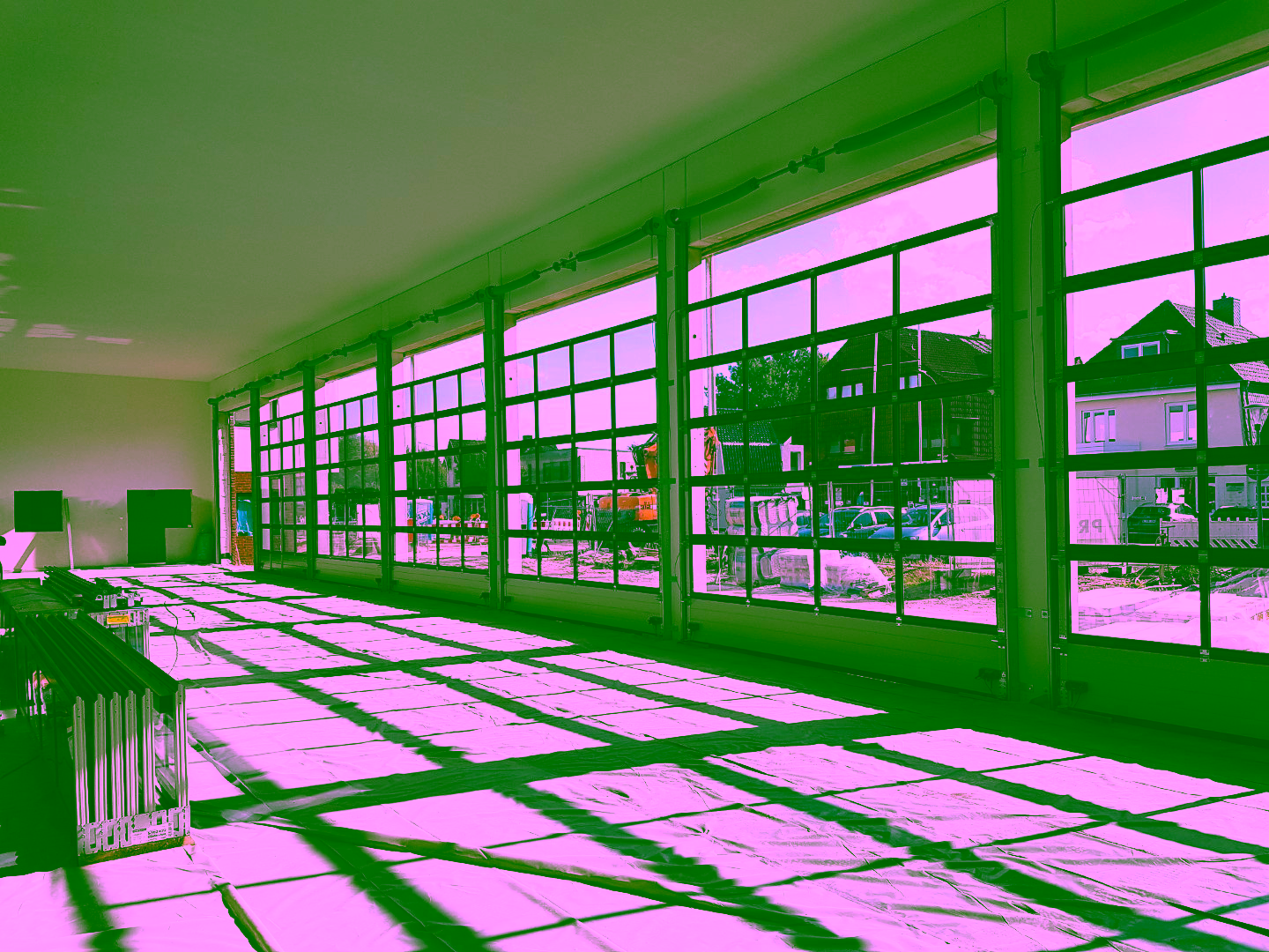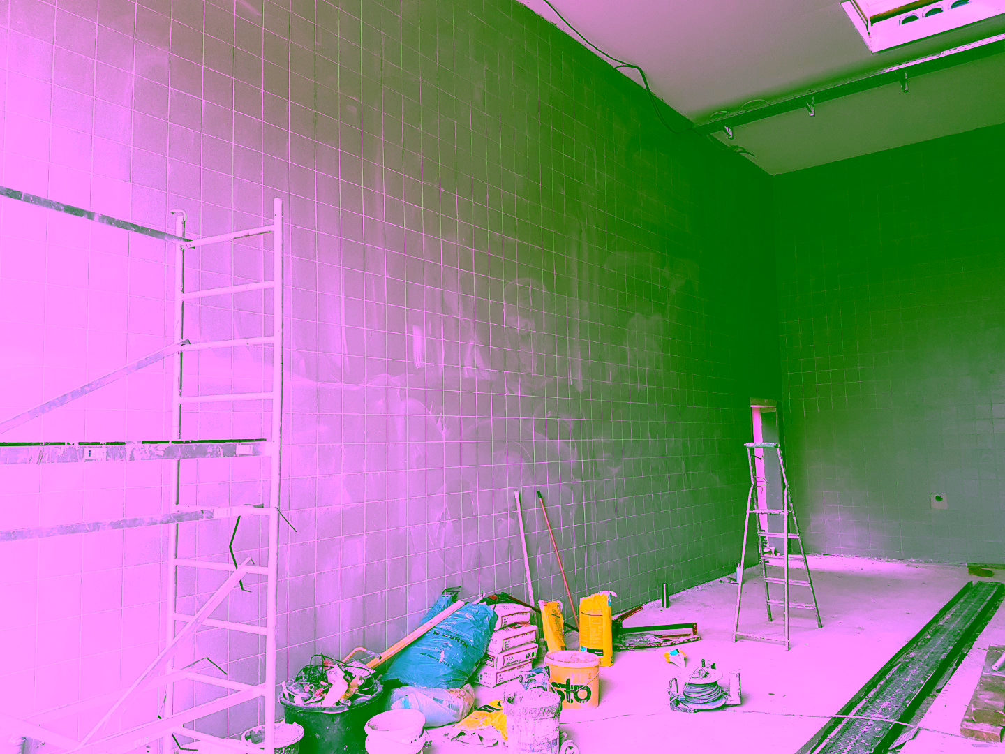 In der Halle lagern auch schon die Deckenstrahlheizkörper und warten auf ihre Montage. Neben diesen gut von außen sichtbaren Fortschritten wurde der Innenausbau weiter vorangetrieben: In der Waschhalle wurden die Wände gefliest, das Lüftungssystem wurde weiter eingebaut, und in vielen Räumen des Obergeschosses mit dem Einbau der abgehängten Decke begonnen. Parallel sind weitere Elektroarbeiten vor allem im Erdgeschoß im Gange.