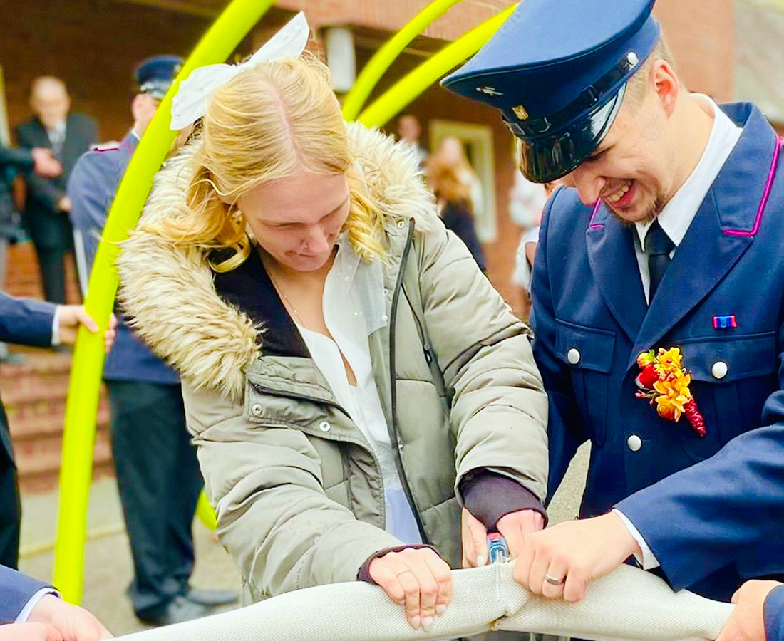 Zwei Kameraden hielten als Hindernis für Leon & Lena diesen einen Feuerwehrschlauch in den Weg, welchen der Bräutigam zu durchtrennen hatte, um mit seiner Angetrauten den Weg fortsetzen zu können. Das gelang Leon mit verschiedensten Werkzeugen und Utensilien, welche ihm zur Verfügung gestellt wurden, zunächst nicht. Erst mit Hilfe seiner Angetrauten konnte der Schlauch endlich durchtrennt und der Weg in eine hoffentlich glückliche Ehe fortgesetzt werden. Wir Kameraden der Feuerwehr Raisdorf wünschen dem Hochzeitspaar auf dem gemeinsamen Lebensweg viel Glück, alles Gute und Gottes reichen Segen!