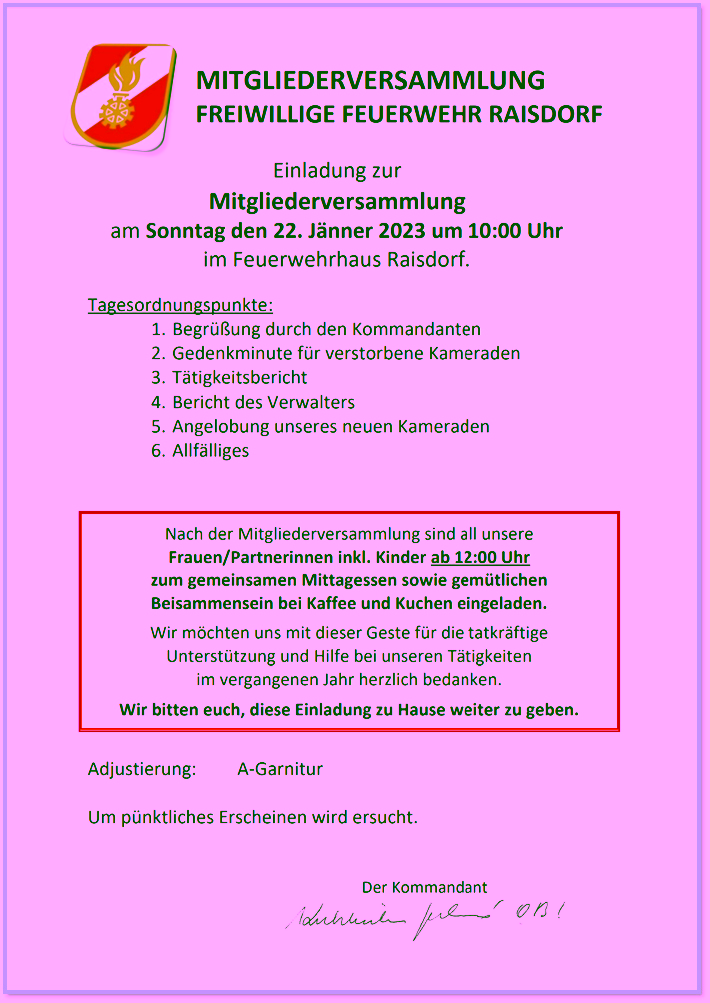Am 27.Dezember 2022 erhielt ich vom stellv. Kommandanten Gernot Hofbauer eine Einladung zur Jahreshauptversammlung der FF Raisdorf / NÖ am 22. Jänner 2023.