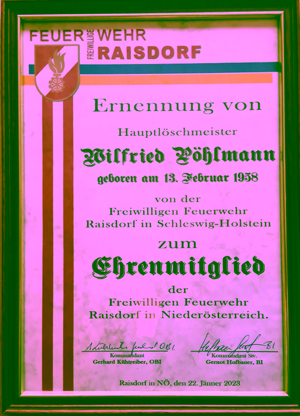 Wilfried wurde am 22. Jänner 2023 zum Ehrenmitglied der Freiwilligen Feuerwehr Raisdorf in Niederösterreich ernannt. Diese besondere Ehrung erfolgte nicht zuletzt wegen Wilfrieds jahrzehntelanger Pflege der Freundschaft mit der Wehr in Raisdorf / Niederösterreich, welche dem Hauptlöschmeister sehr am Herzen liegt.